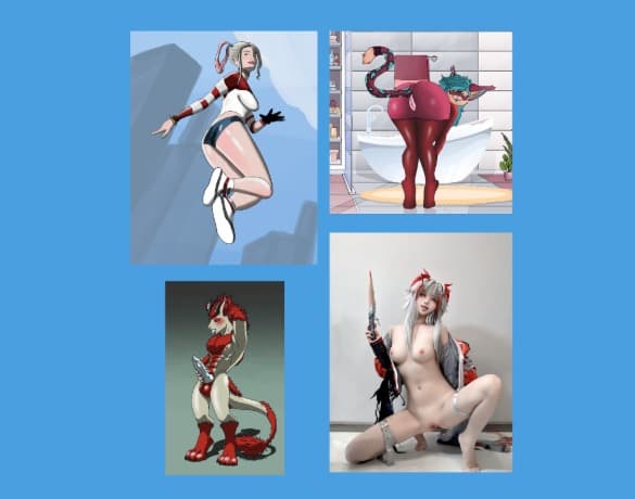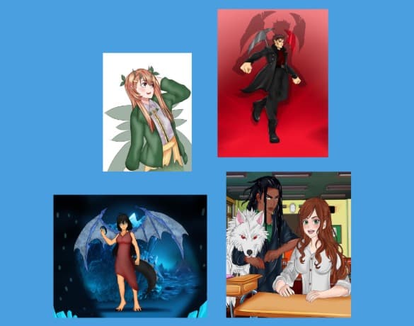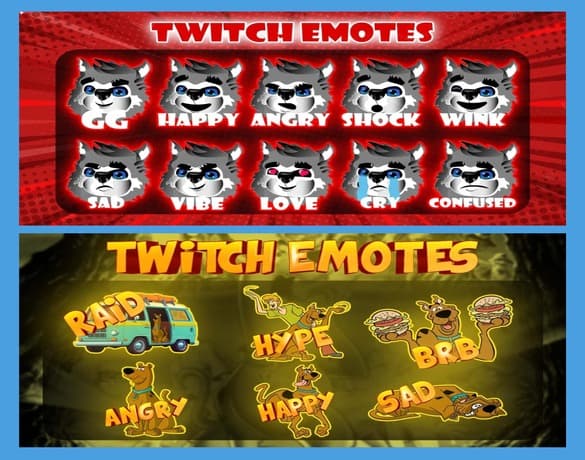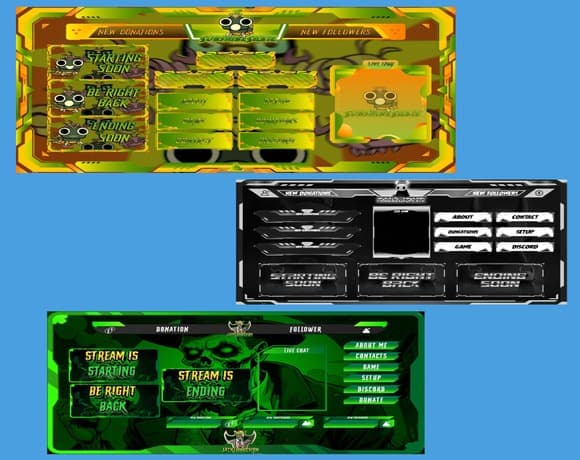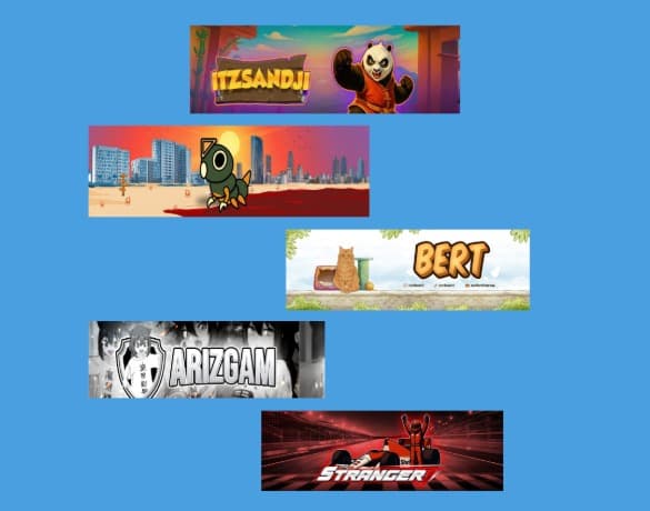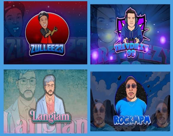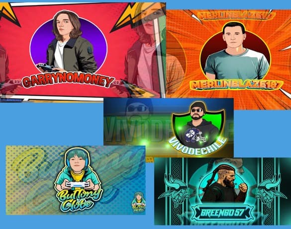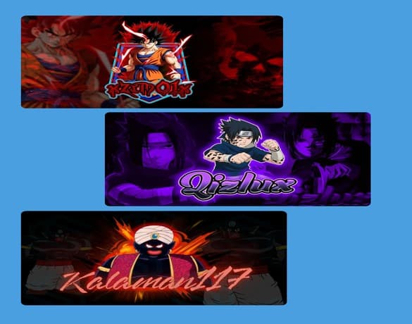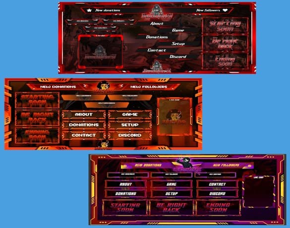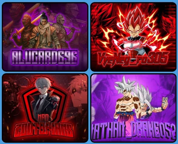 This design features high-impact, anime-inspired gaming logos with bold typography, dynamic characters, and dramatic lighting.